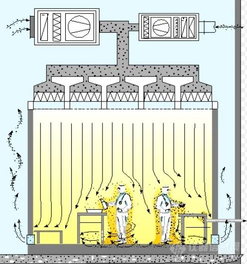 良好的洁净室设计的关键是空气引入(供给)和排出(排气)的适当位置。在布置洁净室时,应优先考虑送风和排风(回风)格栅的位置。进口(天花板)和回风格栅(在较低的位置)应位于洁净室的相对侧。如果需要保护操作员不受产品的影响,则风流应远离操作员。